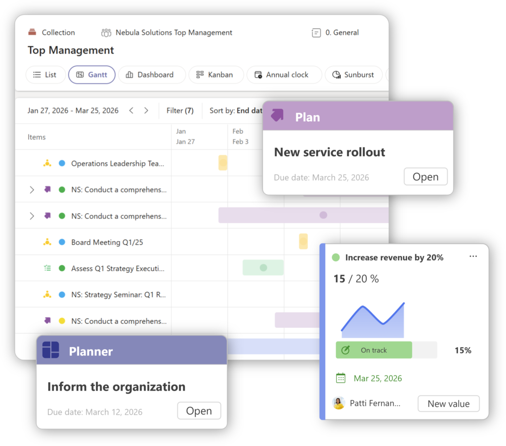 Fingertip links execution to leadership focus by connecting objectives to plans and projects so progress is visible, discussable, and steerable in Teams.