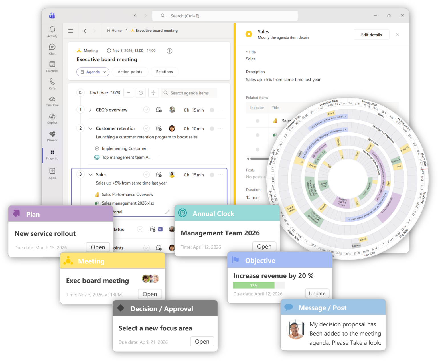 Fingertip creates one shared leadership view inside Teams that stays current across recurring topics, decisions, objectives, plans, and leadership cycles.