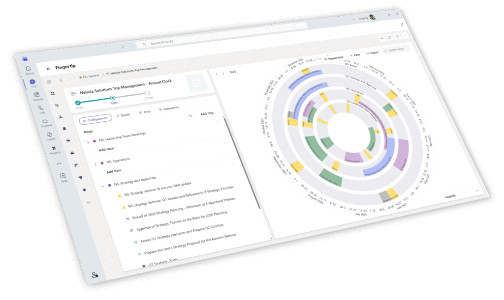 Fingertip’s Annual Clock enables intuitive strategic leadership in teamwork using Microsoft Teams.