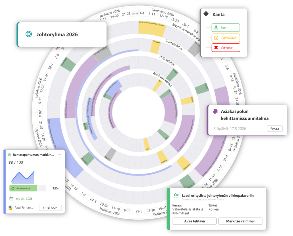 Prioriteetit, päätökset ja seuranta on pidettävä jatkuvasti linjassa strategisten tavoitteiden saavuttamiseksi. Työ ulottuu useiden tiimien ja vastuualueiden yli, ja ilman johtamisjärjestelmää vastuu hämärtyy, seuraavat vaiheet hajaantuvat ja prosessi hidastuu.