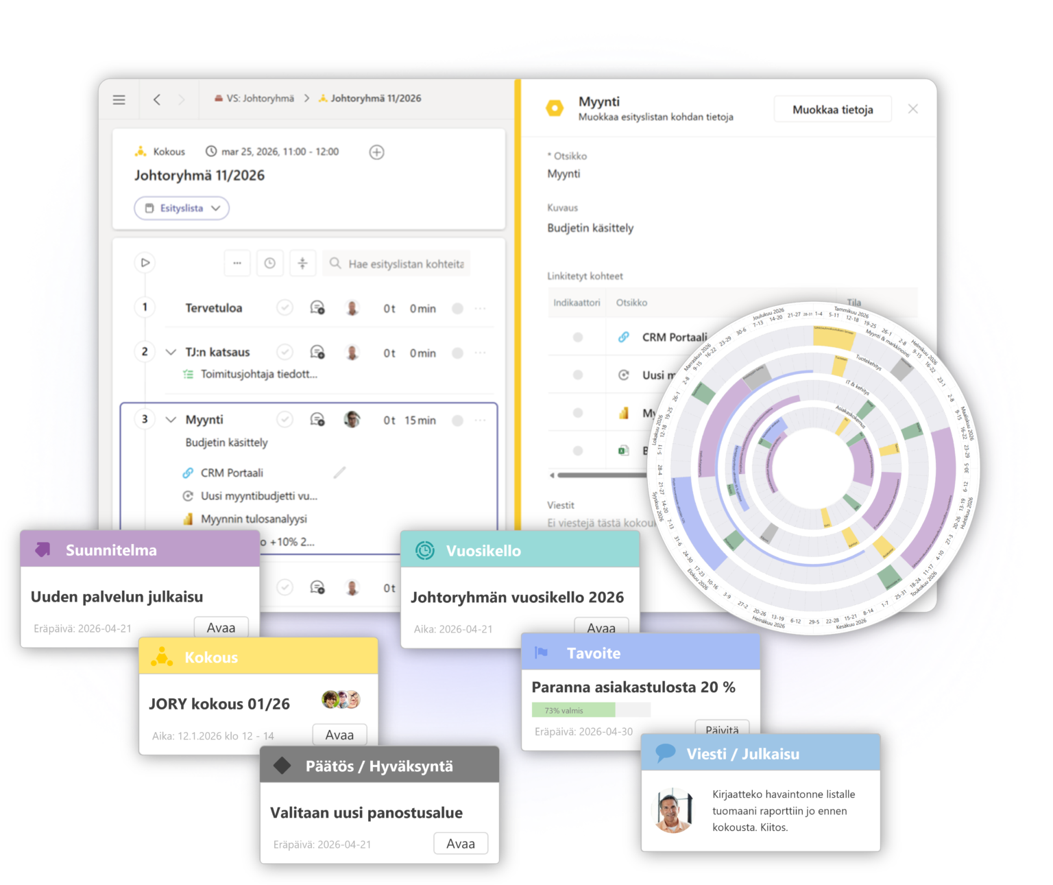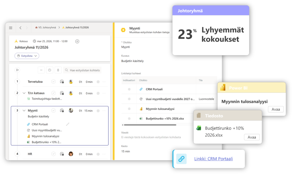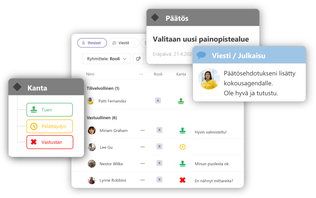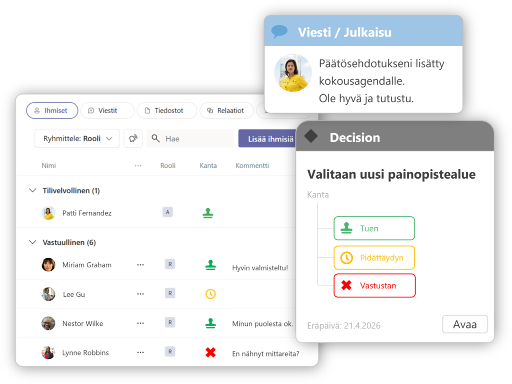 Päätösesitykset, perustelut ja omistajuus pysyvät jäljitettävissä, ja hyväksynnät etenevät Teamsissa.