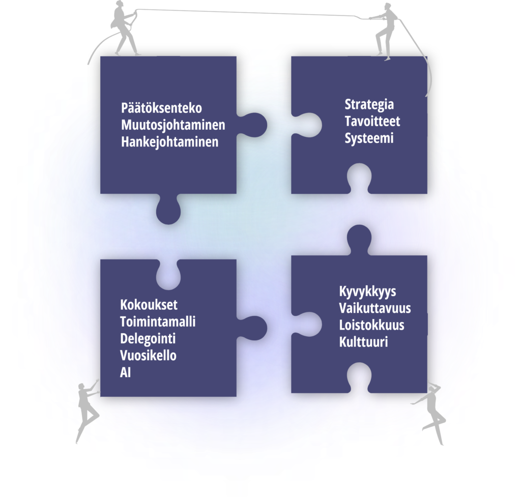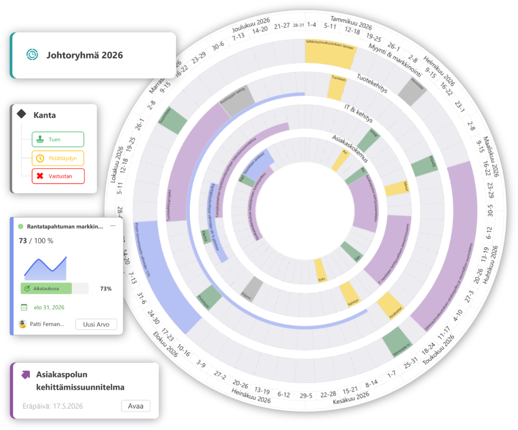 Johtoryhmille se tarjoaa muutoksen johtamisen ja kokonaiskuvan. Samalla tiimeille syntyy selkeät vastuut ja omistajuus, vähemmällä raportoinnilla.