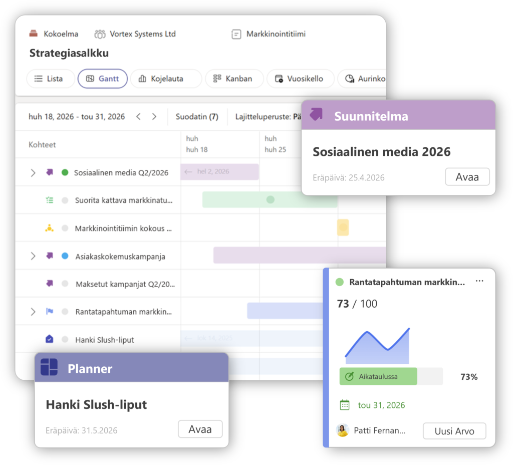 Unohda siiloutunut tieto ja pirstaleiset prosessit. Luo jaettu tilannekuva ja varmista toimeenpano siellä, missä tiimisi jo työskentelee: Microsoft Teamsissa.