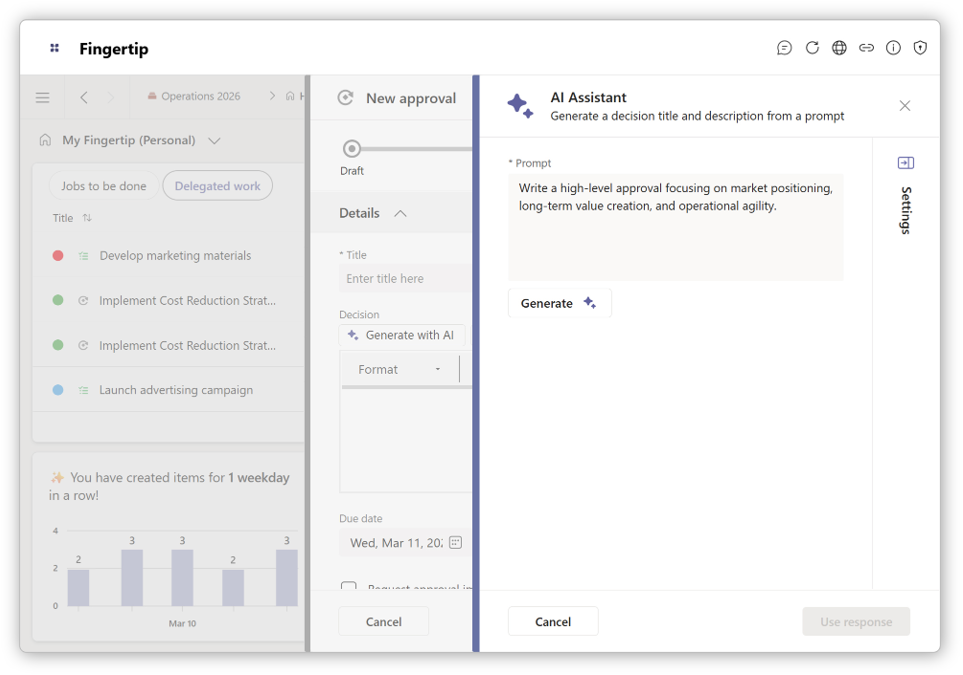Älykkäät luonnokset: Fingertip 5.0 esivalmistelee päätösehdotukset ja kokousagendat puolestasi. Se poistaa aloittamisen vaikeuden luomalla valmiita pohjia, jotka perustuvat organisaatiosi todelliseen tilanteeseen.