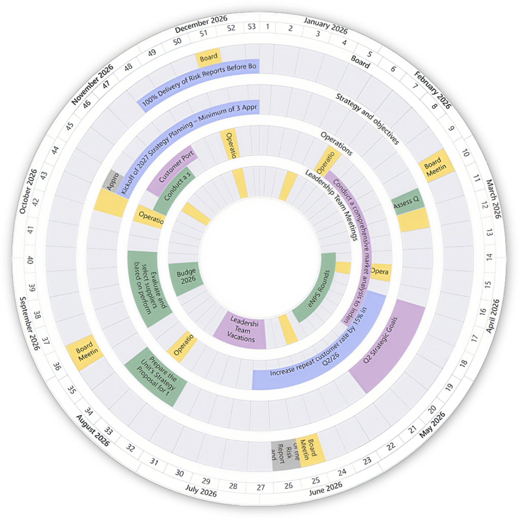 Configure up to five rings from Teams Collections, Plans, Planner, or Outlook calendars, creating a single annual clock in-context securely.