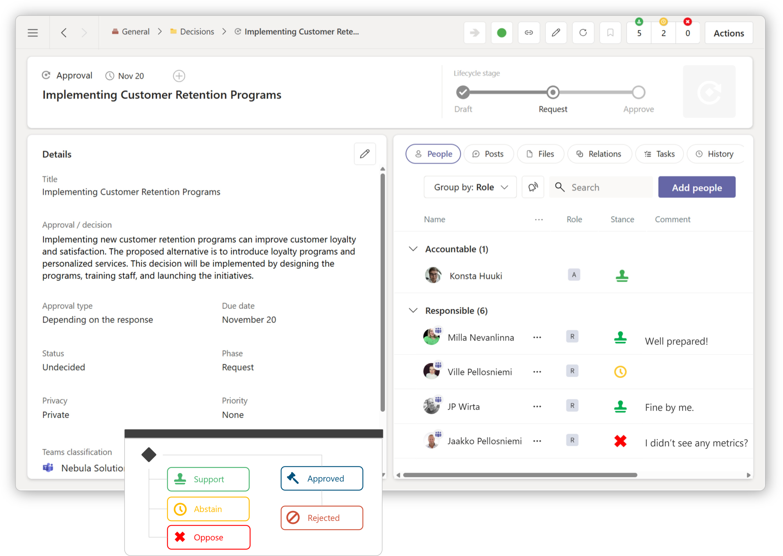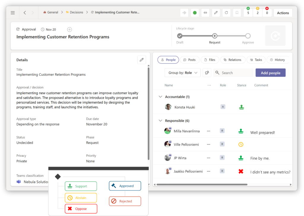 Uutta 5.0: Näet selvästi, kuka johtaa ja kuka vastaa kustakin päätöksestä. Seuraa päätöksiä paremmin ideasta toteutukseen asti.
