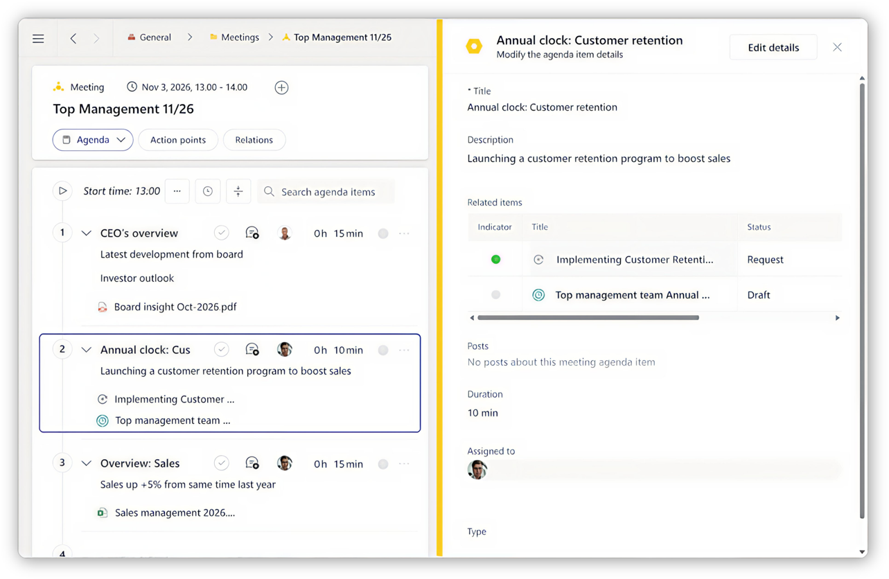 Link decisions directly to actions and responsibilities. Progress stays visible between meetings, so leaders always know whether decisions are moving forward or need attention.