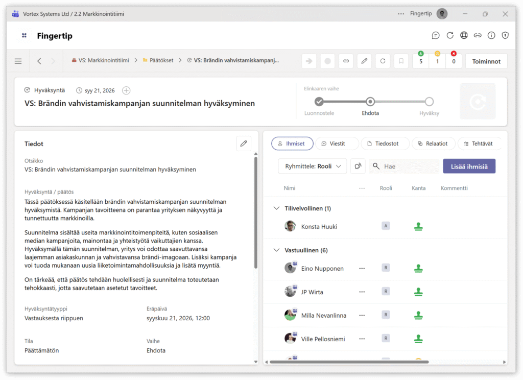 Fingertipillä on ainutlaatuinen päätöksentekoprosessi, joka on integroitu Microsoft Teamsiin. Se tekee päätöksenteon valmistelusta, tekemisestä ja seurannasta vastuullista, yhteistoiminnallista ja läpinäkyvää, mikä parantaa päätöksenteon laatua ja nopeutta. Näin se toimii: