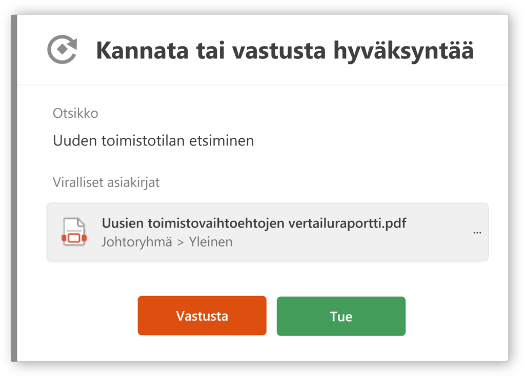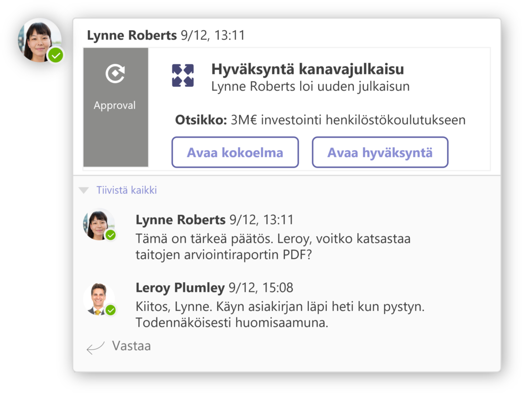 Kaikki tapahtuu Microsoft Teamsissa. Päätökset, keskustelut ja seuranta tapahtuvat siellä, missä työnteko jo tapahtuu, ilman työkalujen vaihtamista tai tietojen päällekkäisyyttä.
