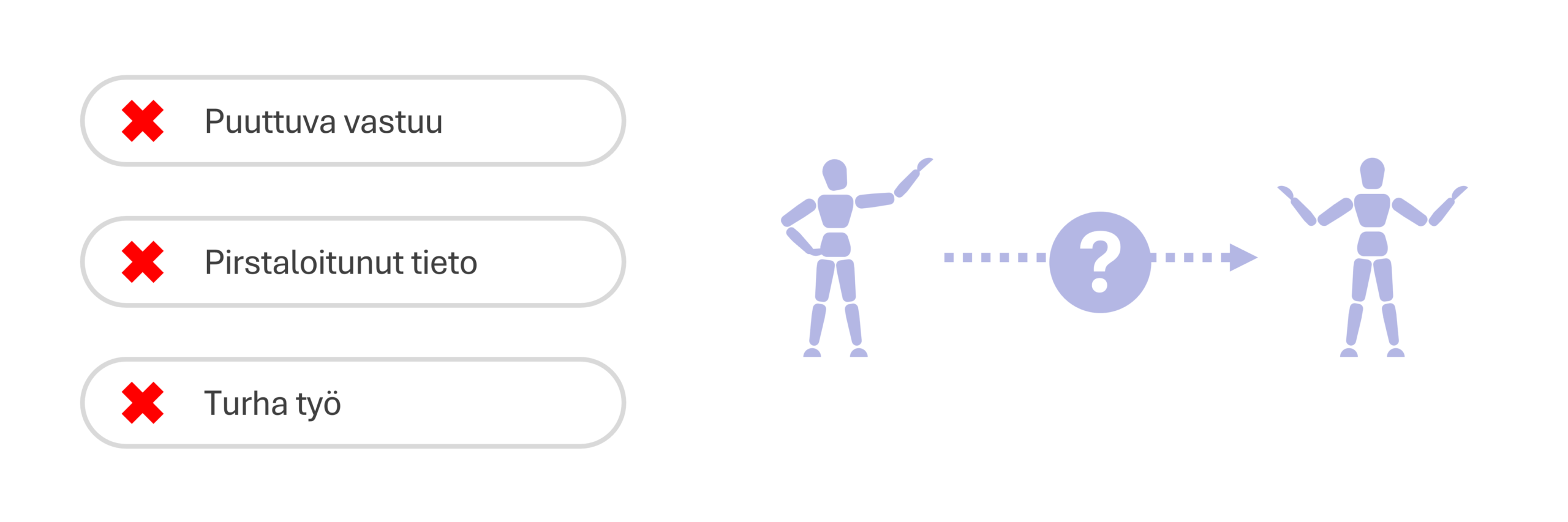 Kun oikeita henkilöitä ei kuulla ajoissa, päätökset kostautuvat toteutusvaiheessa. Puuttuva tieto paljastuu liian myöhään, mikä johtaa jatkuvaan reagointiin ja laadun heikkenemiseen.