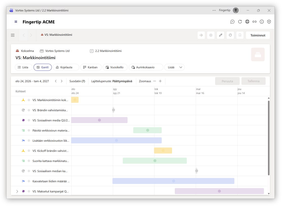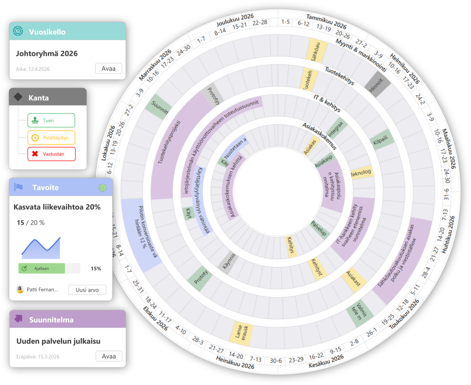 Staattiset suunnitelmat muuttuvat helposti ikäviksi yllätyksiksi, kun määräajat paukkuvat ja laatu kärsii. Fingertip tuo vuoden rytmin, vastuut ja edistymisen näkyväksi.