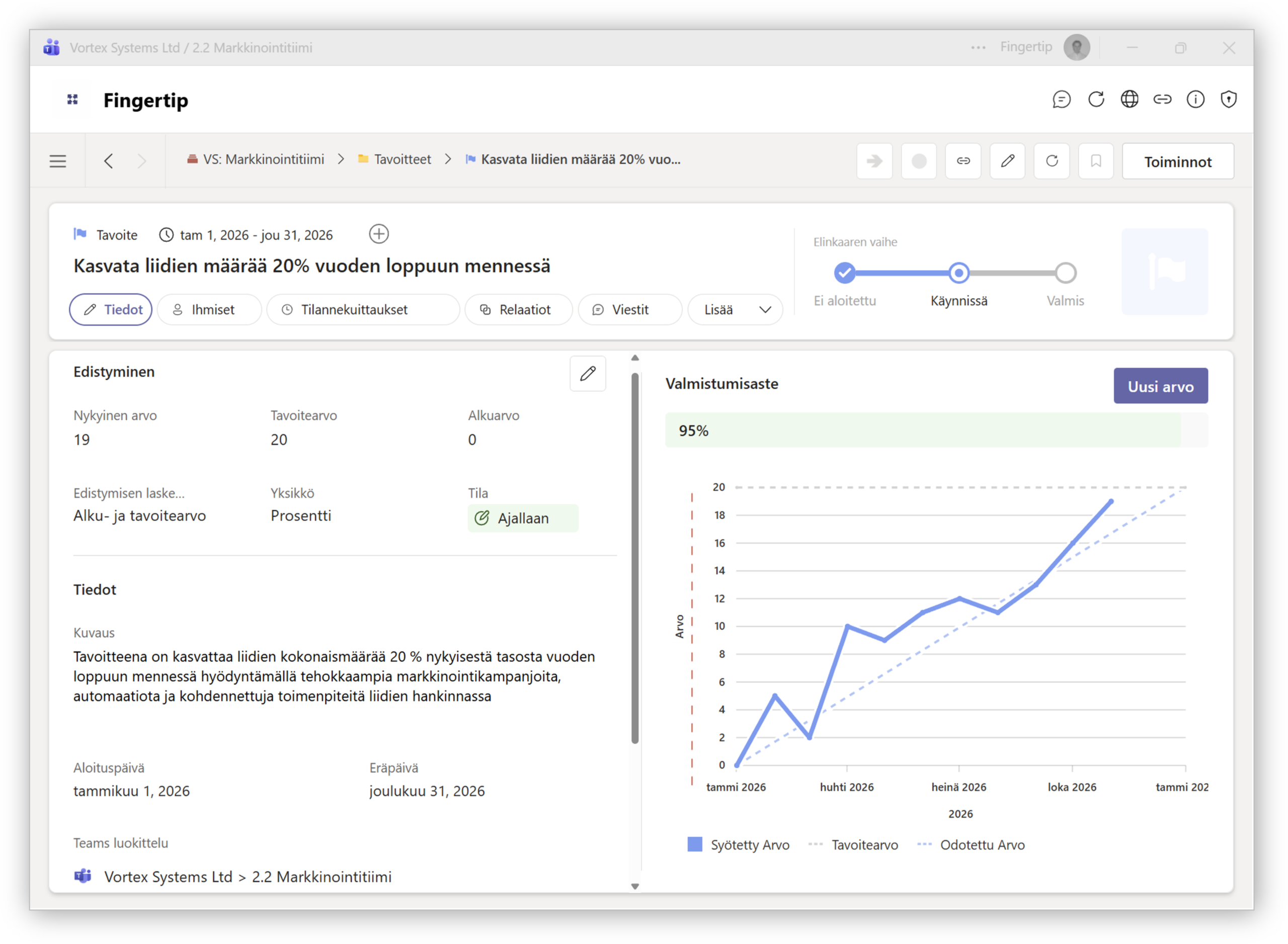 Muuta strategia mitattaviksi tavoitteiksi ja määrittele selkeät välitavoitteet sekä vastuuhenkilöt. Fingertipin avulla seuraat edistymistä reaaliajassa – näet tilanteen päivittäin, etkä vain neljännesvuosittaisissa katsauksissa.