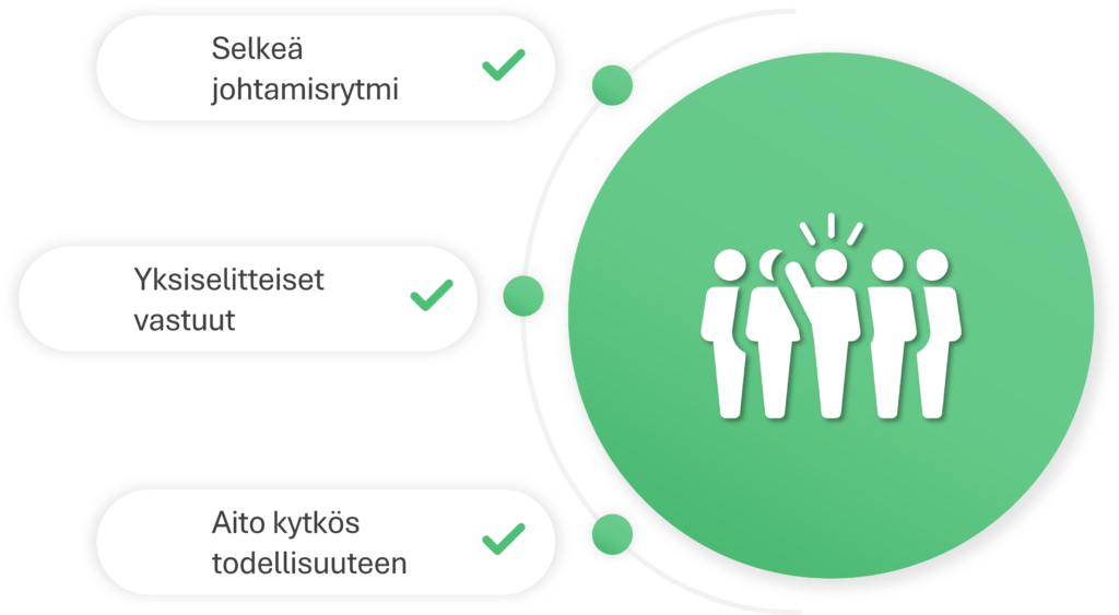 Luo johtamisvuodelle yhtenäinen rytmi, jossa strategiset riippuvuudet tulevat näkyviksi jo suunnitteluvaiheessa. Näin johtoryhmä pystyy ennakoimaan pullonkaulat ja tekemään päätöksiä ennen kuin niistä muodostuu esteitä kasvulle.