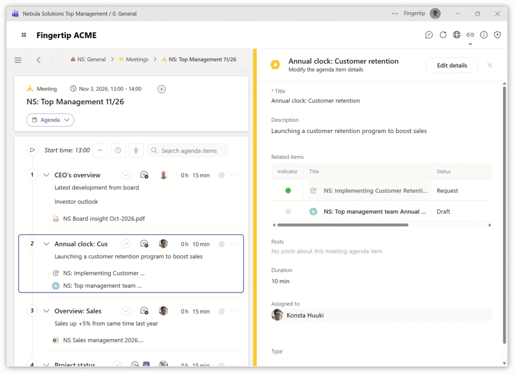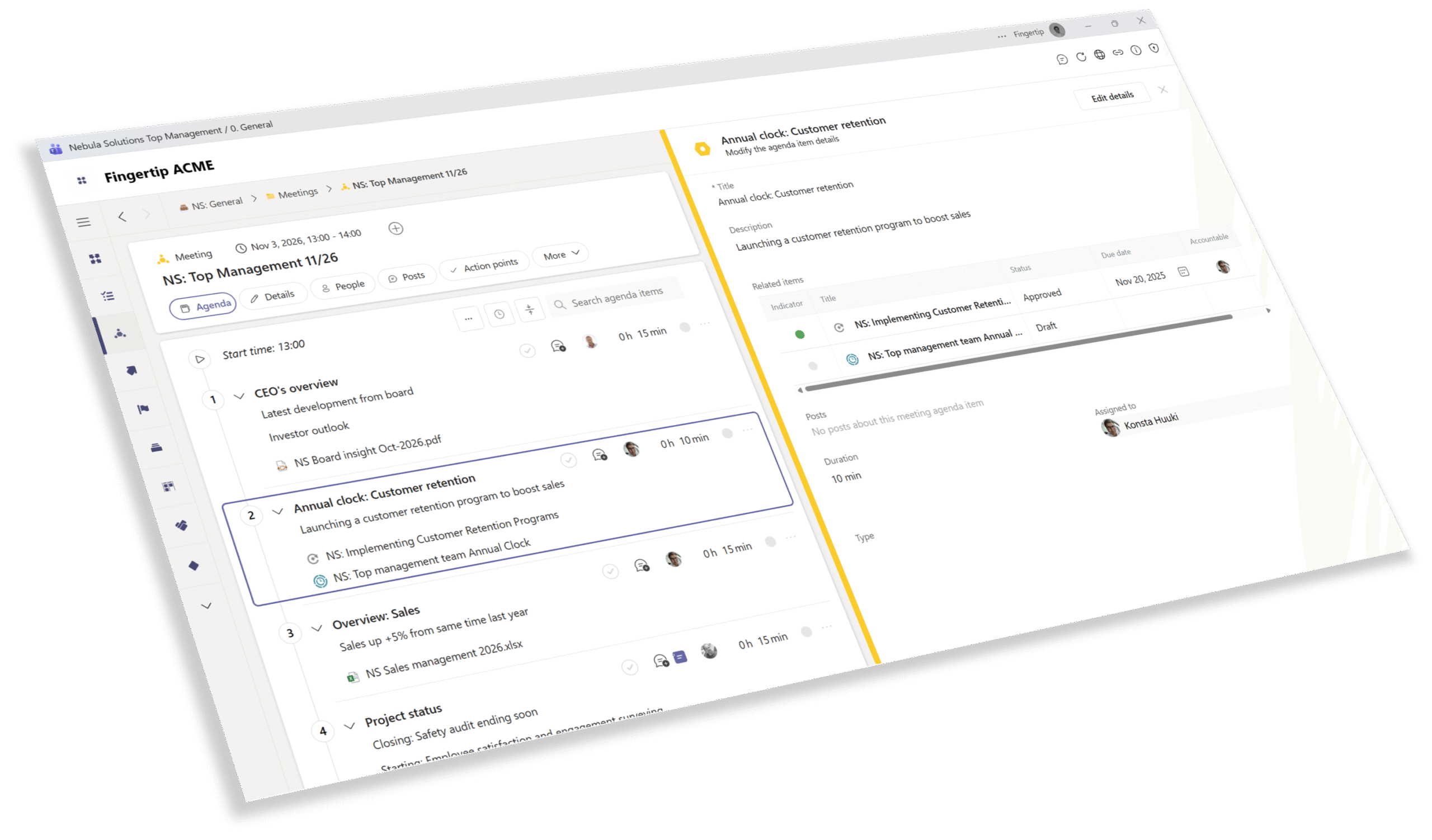 Fingertip forces you to think beforehand: Why is this meeting necessary, who should take part and what will we touch upon. You can collaborate in creating the agenda, linking all relevant tasks and discussion. Preparing happens simply as part of Teams use, without big changes in operating model, which ensures it is actually used.