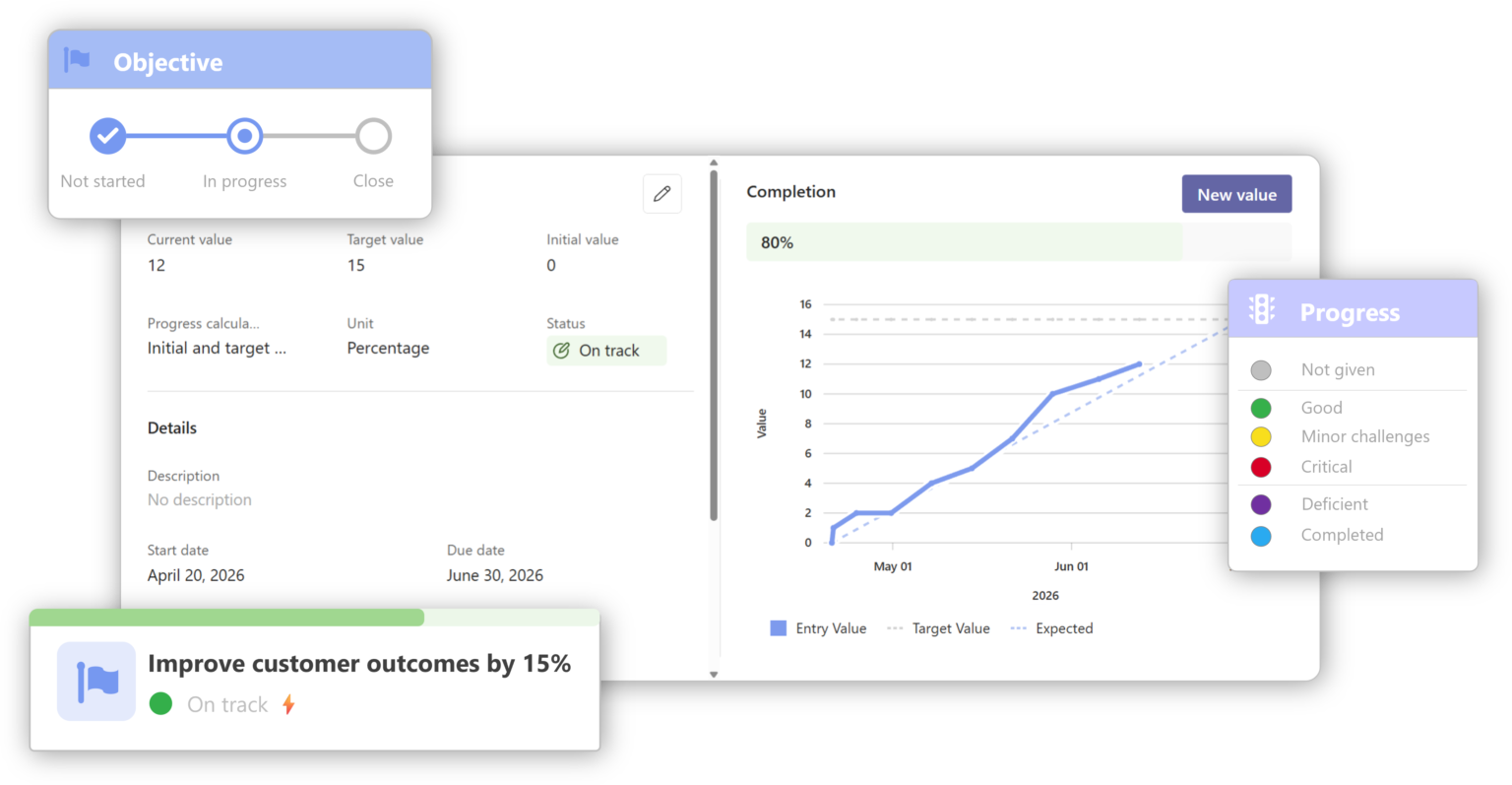Objectives stay visible in the same Teams channels and meetings where execution is discussed, so risks surface early and follow-through becomes routine.