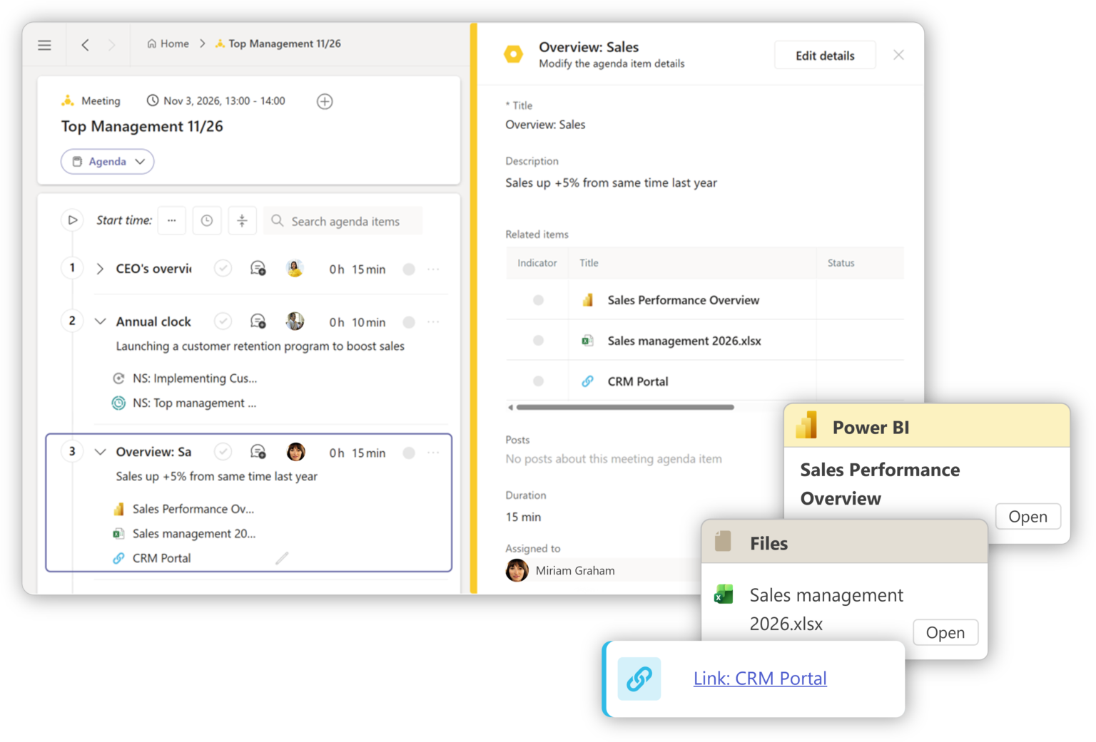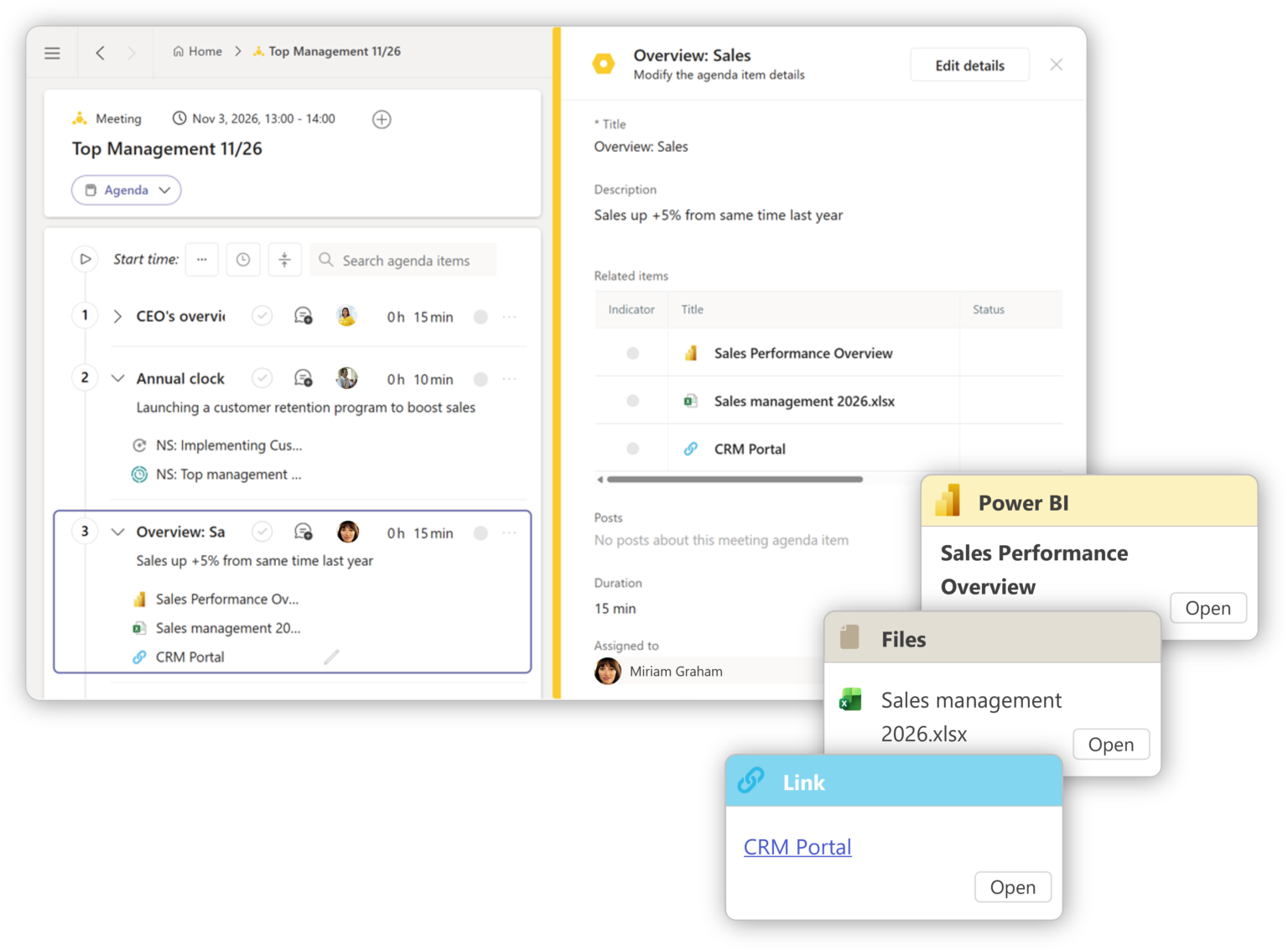 Agenda, pre-work materials, minutes, and actions stay in one shared place, reducing fragmentation and eliminating separate note-taking and recap routines.
